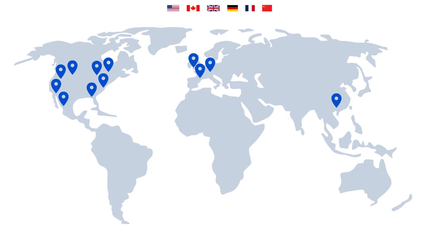 我们在美国、加拿大、英国、德国、法国等10余个目的国运营35+海外仓(含海关监管仓),总面积超1,614,600ft²,重点布局核心节点城市: